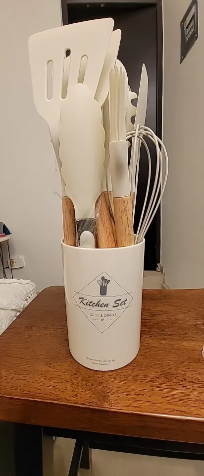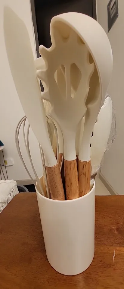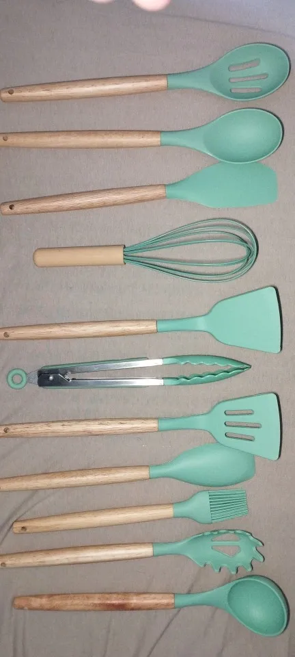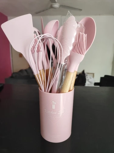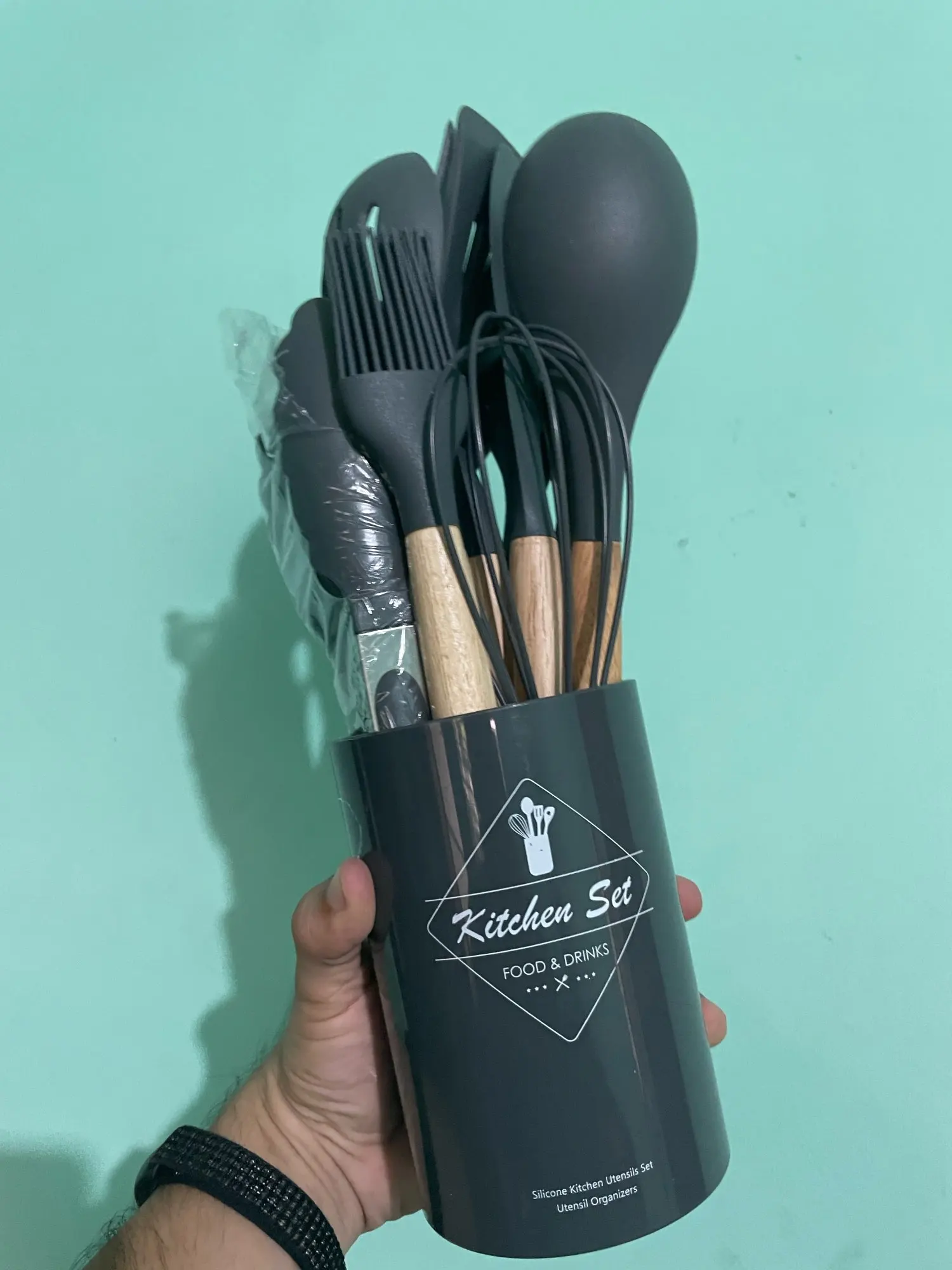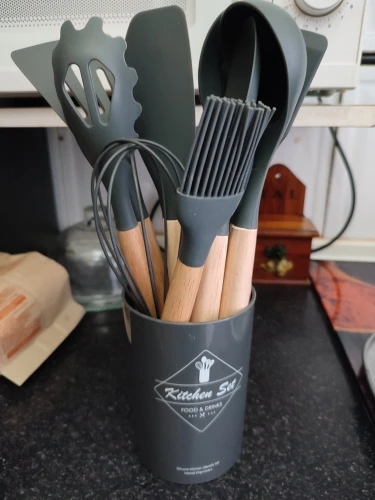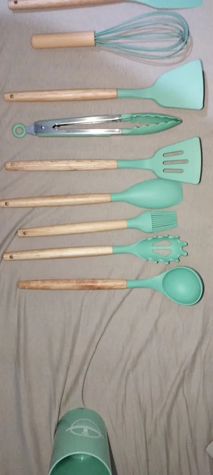 Woow amazing kitchen cooking set, I loved it, the materials are good, not so industrial quality but enough for domestic and casual cooking, excellent quality/price ratio, the silicone material looks resistant to heat and slides well in my pan, definitely is a essential product in my opinion, totally recommended product and seller.