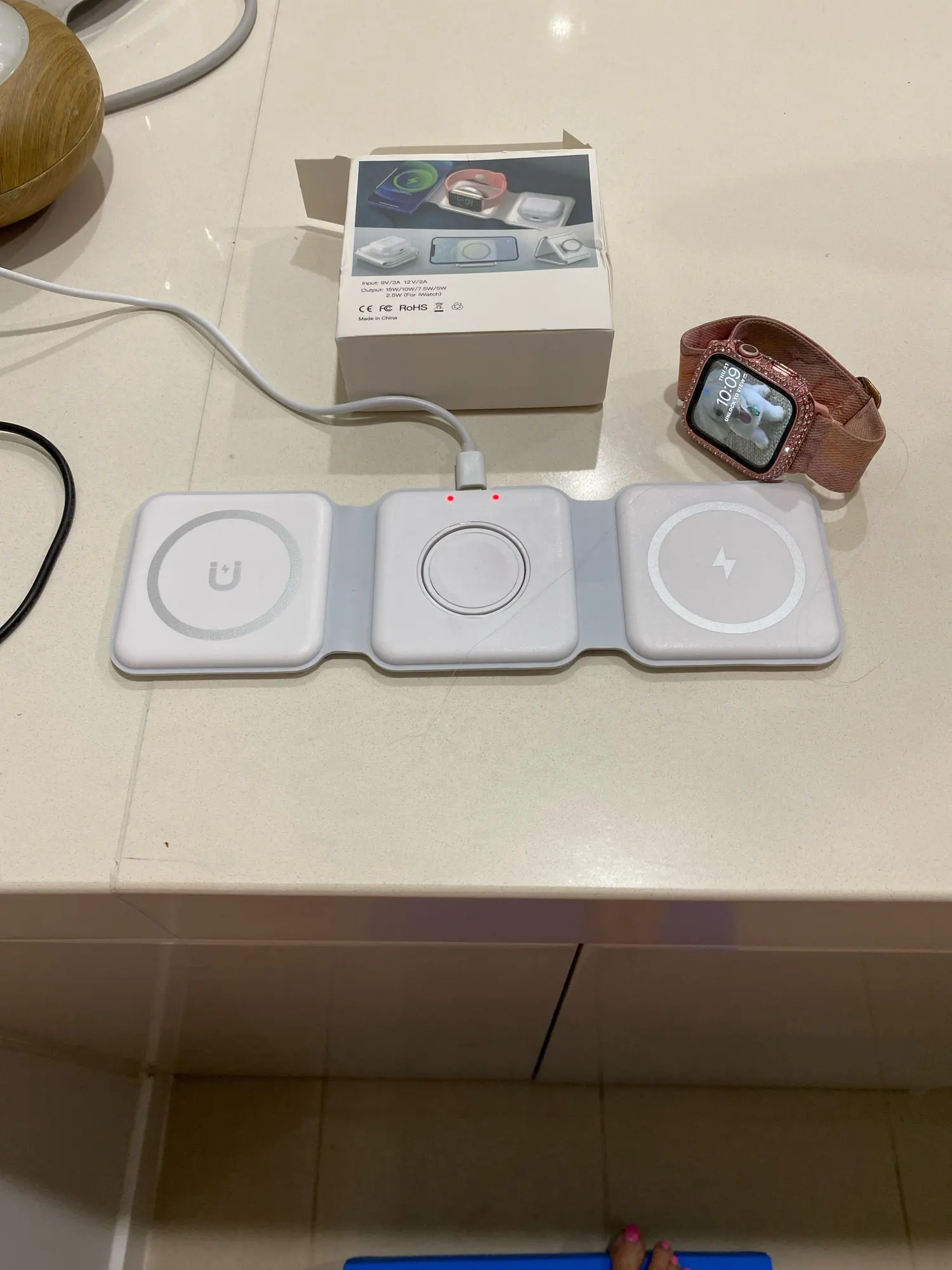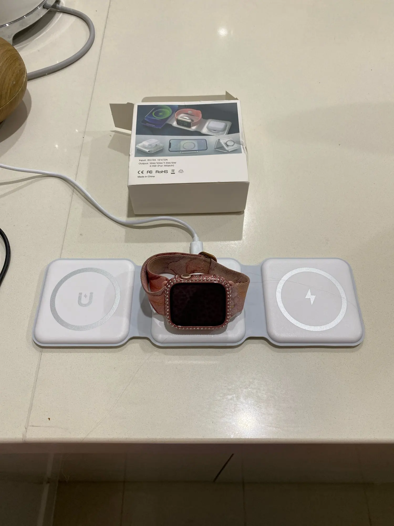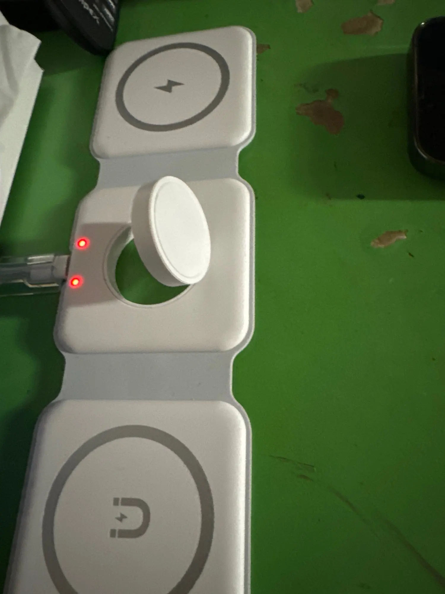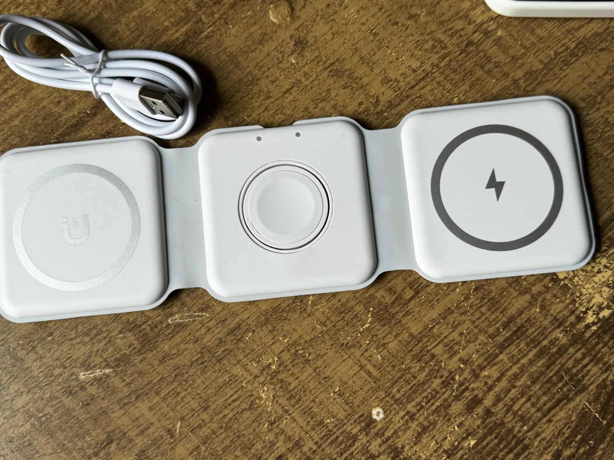 I have only tried it out a little bit because I ordered a more permanent one for my bedside table. This one is for travel, and it folds up so nice and small on the requiring one cable to charge three devices. ❤️ fast delivery to Canada.